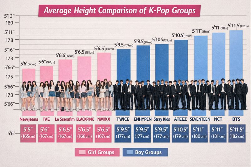 Height plays a key role in how K-pop groups are perceived on stage. Rather than focusing on individual idols, this article compares some of the tallest and shortest K-pop groups based on average member height, with added context from each group’s tallest and shortest members.
